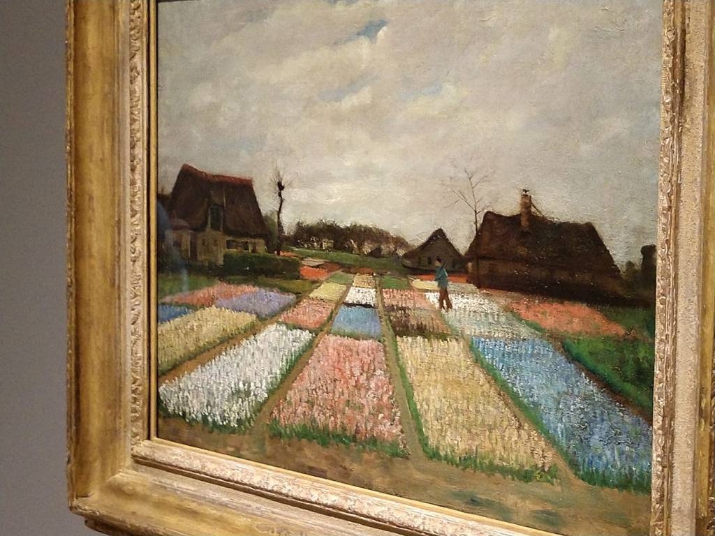 As constant depression, sickness, and poverty dogged his steps, Vincent Van Gogh delivered his 1st garden painting, pictured above – Bulb Fields, 1883. The cellphone picture does nothing to convey the rich, colorful tableaux. To the cursory observer, it looks as though it is just another boring landscape. But a more focused survey will yield a bountiful reward. The brush strokes are painstakingly detailed, and give a sense of joyous, even riotous existence, even amid the desolate and darkening sky. The lone walker could be you or me. We are invited to stop and rest a while.