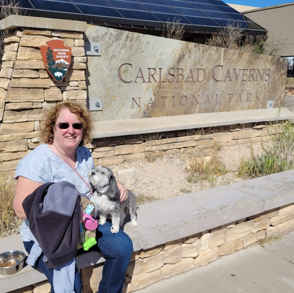 Although we were traveling during the month of October, it was still fairly warm in the New Mexico desert. It was, therefore, a relief to get underground in the Caverns where the temp hovered around 45F. Sadly, Molly was not allowed to descend with us, but there were kennels available onsite. She was happy to know we got pics afterwards, however.