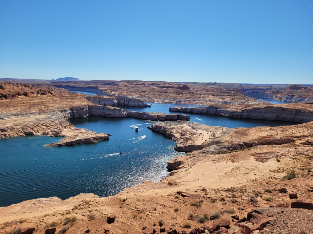 Another view of Glen Canyon, the Visitor Center, and Page in the distance, sitting atop the mesa.